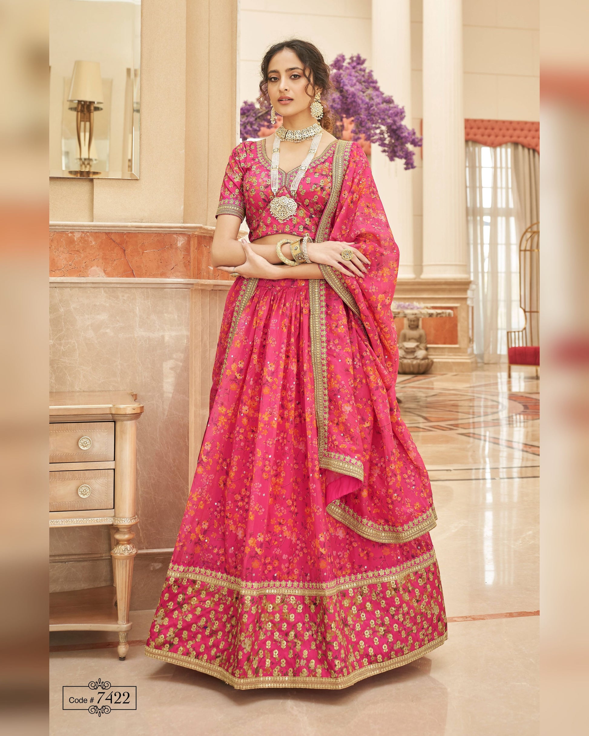 This Pink Organza Art Silk Blouse and Lehenga set is crafted for Indian and Pakistani wedding celebrations, reflecting exquisite artistry and elegance. Featuring intricate thread, zari, dori, and sequin embroidery, it beautifully highlights the fabric’s lustrous texture with meticulous embellishments. Combining comfort with style, the ensemble ensures ease of movement while honoring traditional embroidery craftsmanship, making it an ideal choice for festive occasions..