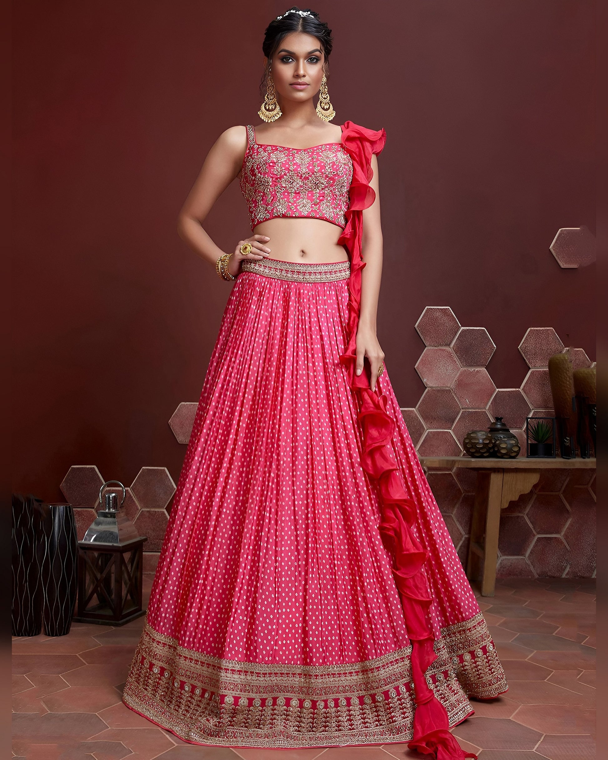Pink Chinon Silk Lehenga Choli With Blouse & Dupatta For Indian & Pakistani Wedding Festival - Digital Print and Heavy Embroidery with Savroski