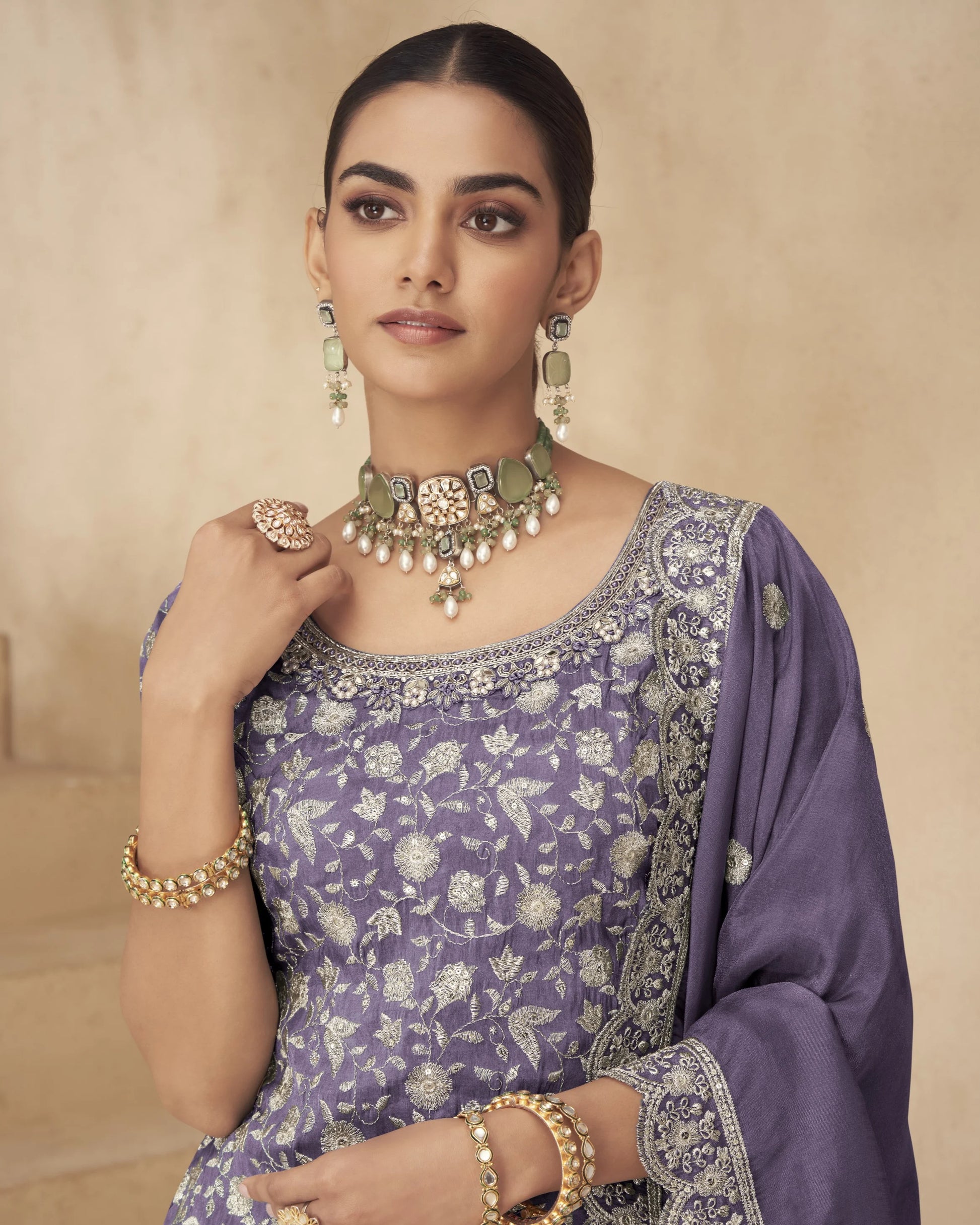 Illuminate your presence at Indian and Pakistani wedding ceremonies with this Purple Shimmer Silk Plazo Suit. Meticulously crafted to combine celebratory vibrance with refined sophistication, it features exquisite Thread and Sequence Embroidery that enhances the silk’s subtle shimmer and opulent texture. This outfit offers a perfect harmony of comfort and elegance, allowing you to move gracefully throughout your special event..