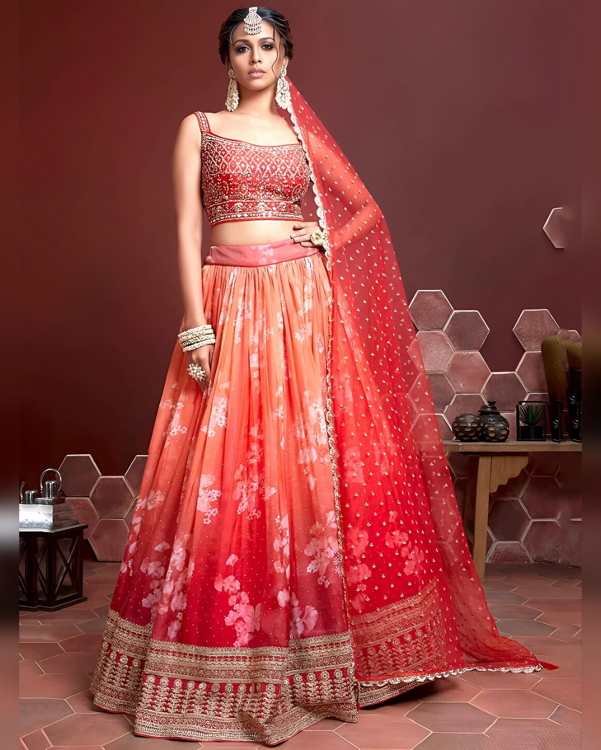 This distinguished Orange Organza Silk lehenga choli exemplifies the convergence of traditional craftsmanship and contemporary design philosophy. The complete three-piece set features sophisticated Digital Print work alongside hand-applied Embroidery, Swarovski accents, and genuine mirror embellishments that celebrate Indian and Pakistani wedding heritage. The premium Organza Silk fabric provides exceptional drape and breathability, enabling comfortable movement throughout extended festivities. Meticulous attention to construction and ornamentation throughout the ensemble ensures lasting visual impact and wearability. Perfect for those who prioritize both cultural resonance and polished aesthetics, this lehenga choli stands as an authoritative choice for milestone celebrations and formal events requiring understated elegance..