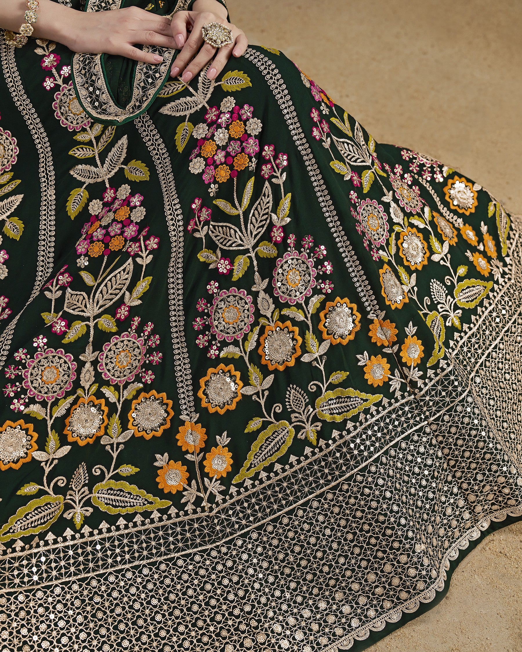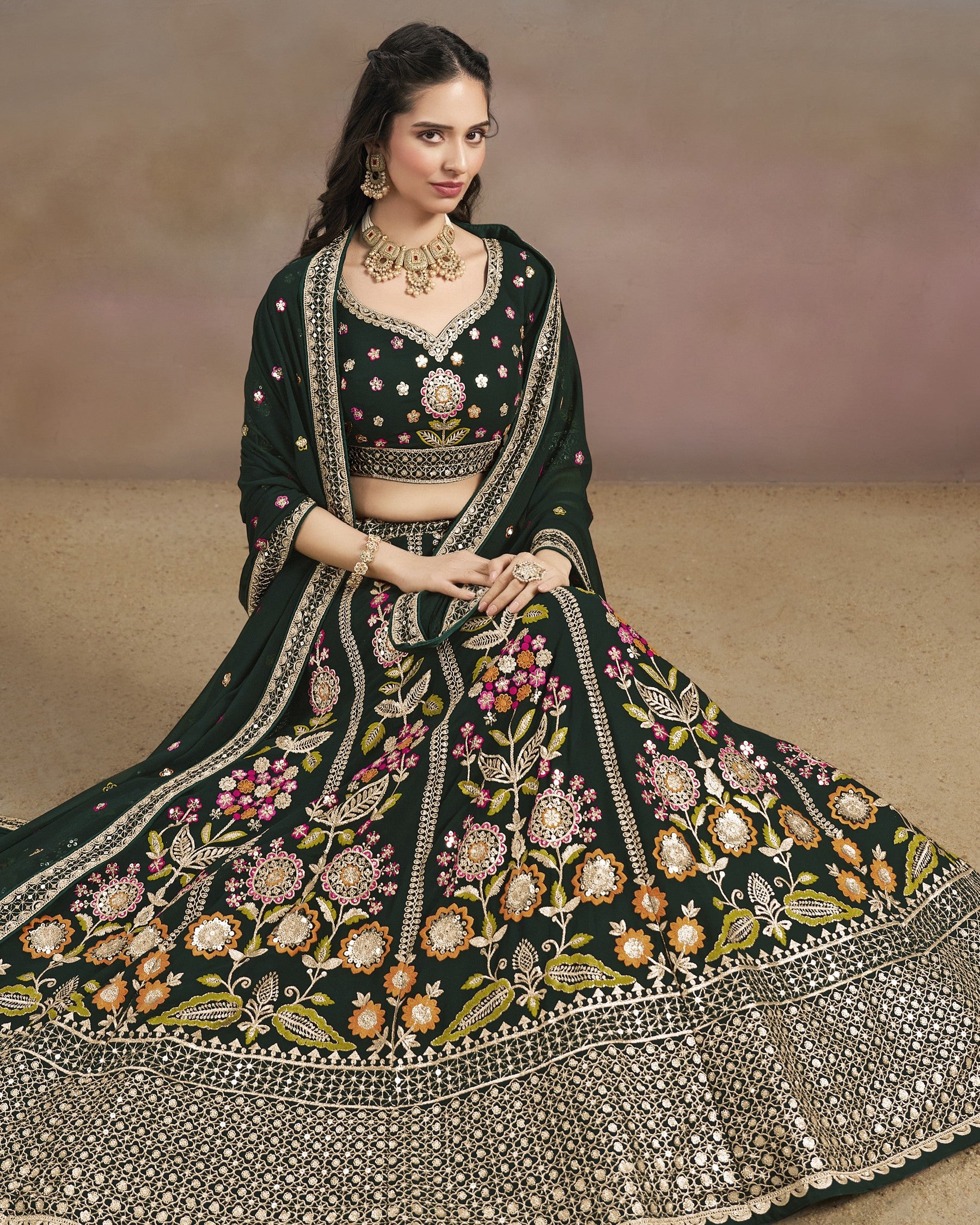 Green Georgette Lehenga Choli With Blouse & Dupatta For Indian & Pakistani Wedding Festival - Sequins & Zari With Dori & Thread Embroidery Work