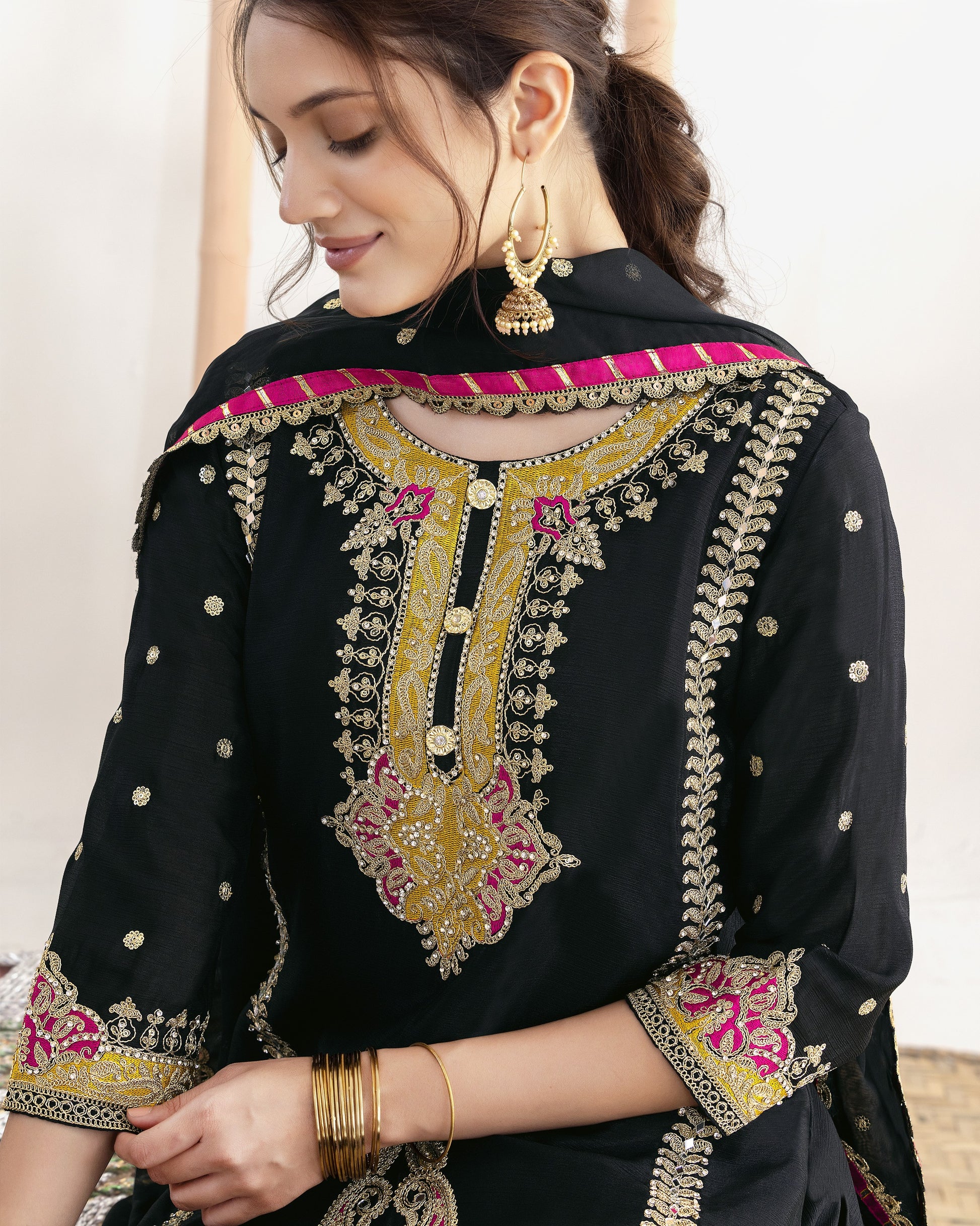 Rendered in sumptuous black chinon silk, this three-piece salwar suit embodies the refined elegance of South Asian heritage. The ornately decorated kameez, expertly tailored salwar, and coordinating dupatta showcase exceptional artisanal skill through elaborate mirror embellishments, precious stone work, and intricate thread and sequin detailing. This ensemble represents generations of inherited craftsmanship, seamlessly merging traditional cultural elements with contemporary design sophistication. An authoritative investment piece for discerning individuals attending weddings, festivals, and prestigious formal occasions..