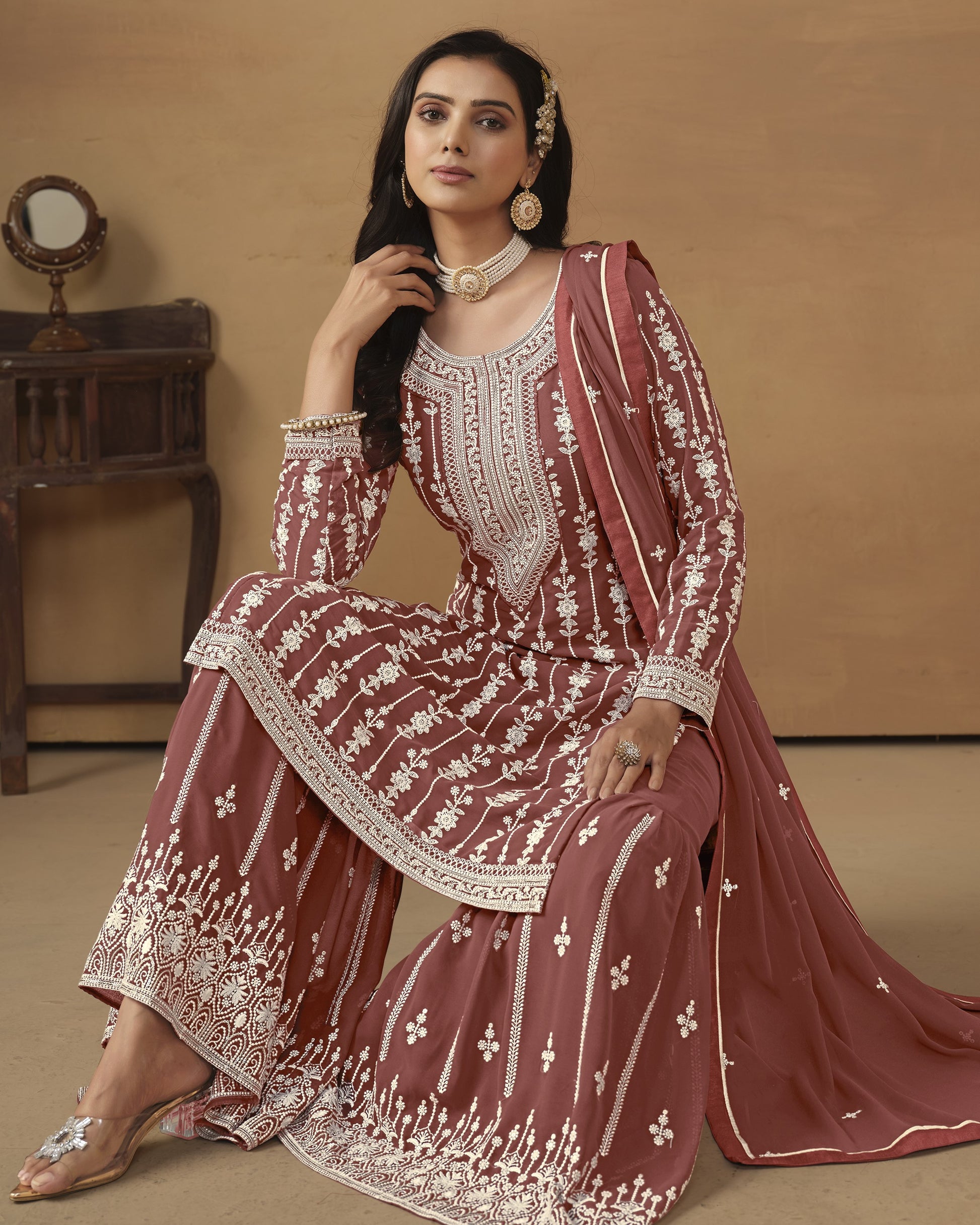 Brown Faux Georgette Sharara Suit With Kameez And Dupatta For Indian & Pakistani Wedding Festival - Thread Sequence Work
