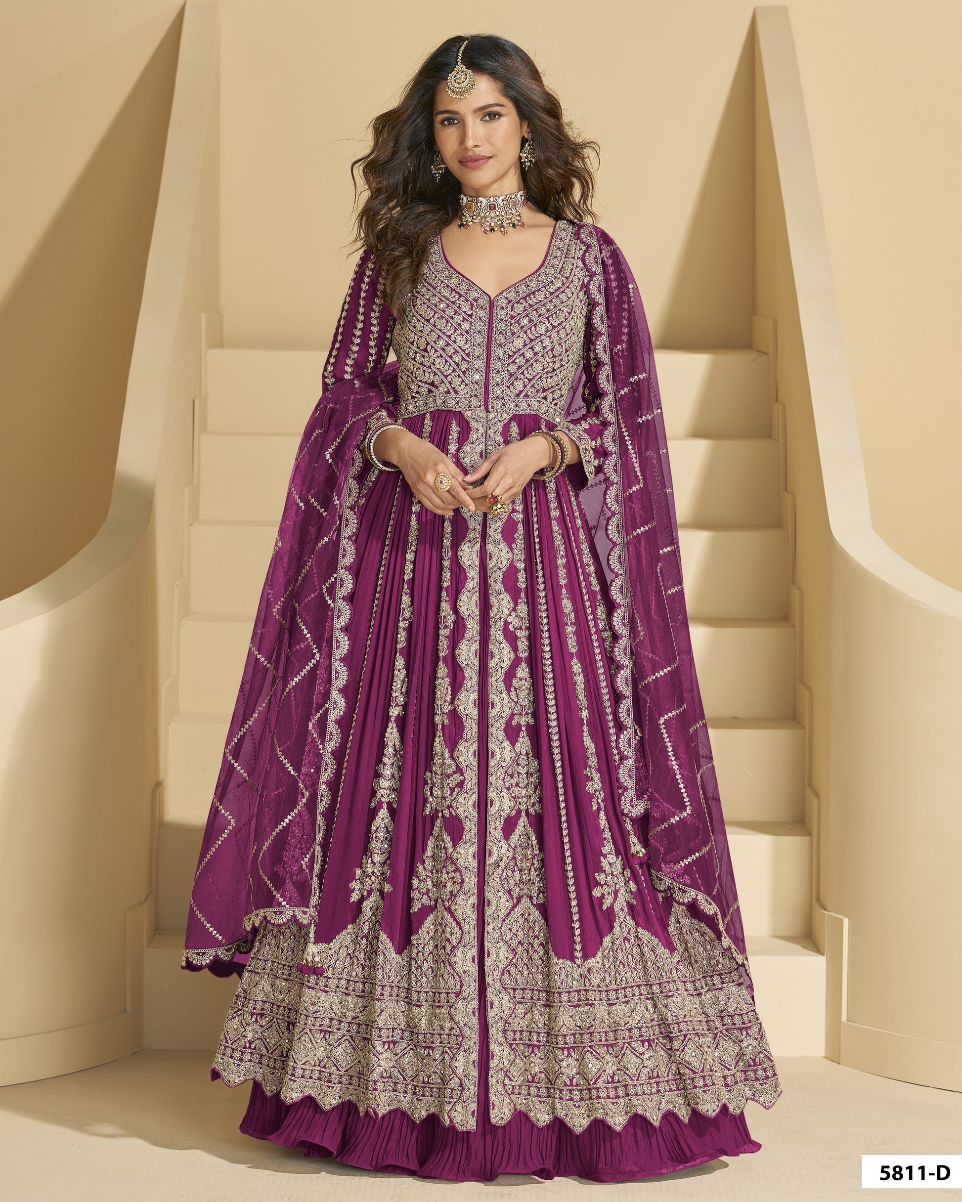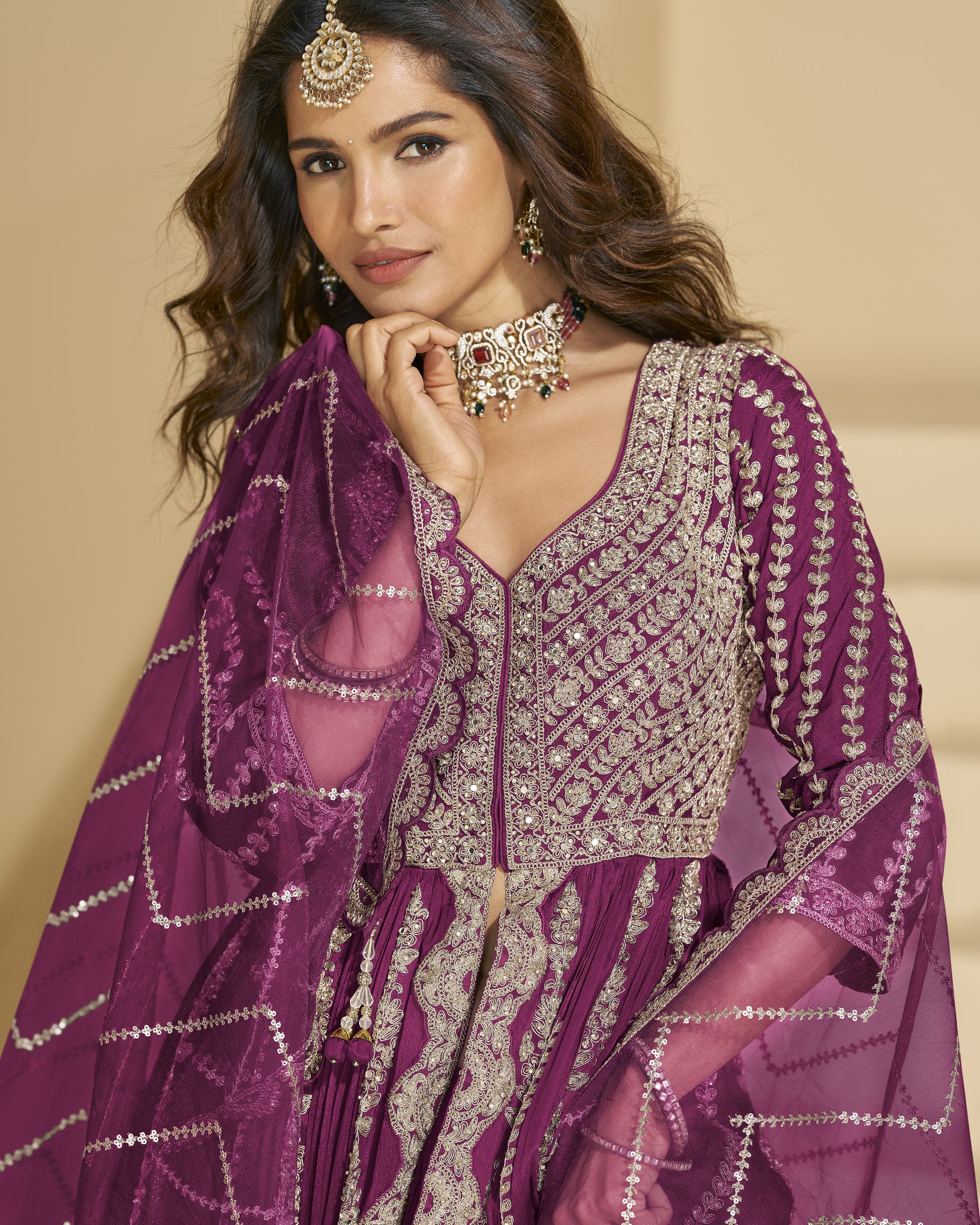 This exquisite Deep Purple Anarkali suit epitomizes refined South Asian tailoring, constructed from luxurious Chinon silk with intricate embellishment work. The design features ornamental mirrors, delicate dori embroidery, and shimmering sequins that create visual depth and sophistication. The iconic Anarkali silhouette offers a universally flattering fit with graceful movement, adapting beautifully across different body types. The complete three-piece collection—suit, coordinating skirt, and dupatta—delivers a unified traditional ensemble with modern sensibility. Ideal for weddings, festivals, and milestone celebrations, this piece represents authentic craftsmanship and meticulous artisanal detail for those who value heritage quality and timeless elegance..