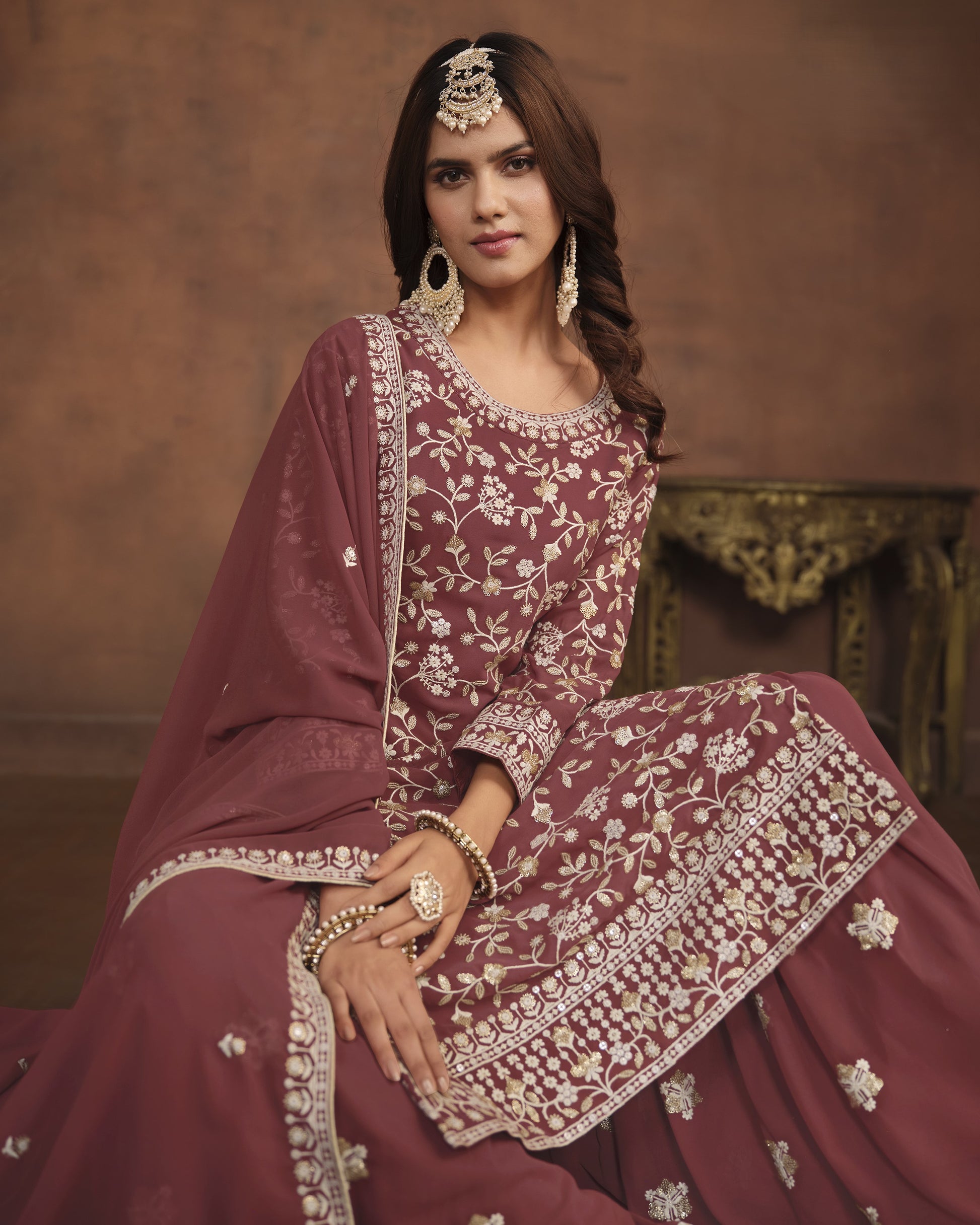 Elevate your festive wardrobe with this striking Maroon Faux Georgette Sharara Suit, a masterpiece designed for discerning celebrations. The ensemble features a coordinated Kameez and Dupatta, unified by meticulous embroidery detailing that enhances the fabric's luminous quality. Crafted with precision tailoring, this three-piece collection delivers a refined aesthetic while ensuring comfort throughout your special occasion. The sophisticated drape and expert construction make this an ideal choice for weddings and cultural festivities where elegance and tradition converge..