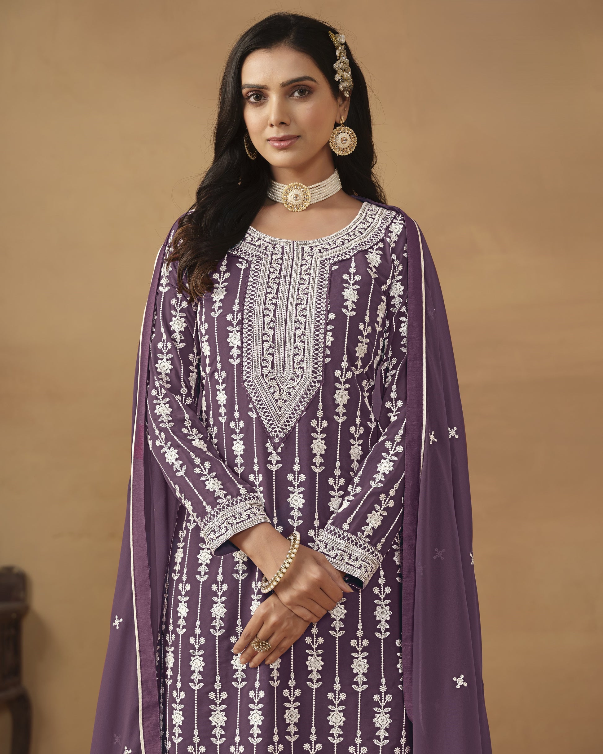 Elevate your festive wardrobe with this exquisite Purple Sharara Suit, a three-piece ensemble that embodies traditional elegance. Crafted from premium faux georgette, the collection features an ornately embroidered Kameez, coordinating Sharara, and flowing Dupatta, each piece designed to drape beautifully and flatter the silhouette. The intricate embroidery detailing showcases masterful artisanship, adding depth and visual interest to the ensemble. The fabric's natural fluidity ensures comfort throughout wear, while superior tailoring guarantees a refined finish. Perfect for weddings, festivals, and special celebrations, this suit represents the finest intersection of heritage Indian and Pakistani design with modern construction standards, offering discerning wearers an authentic statement piece for their most important occasions..