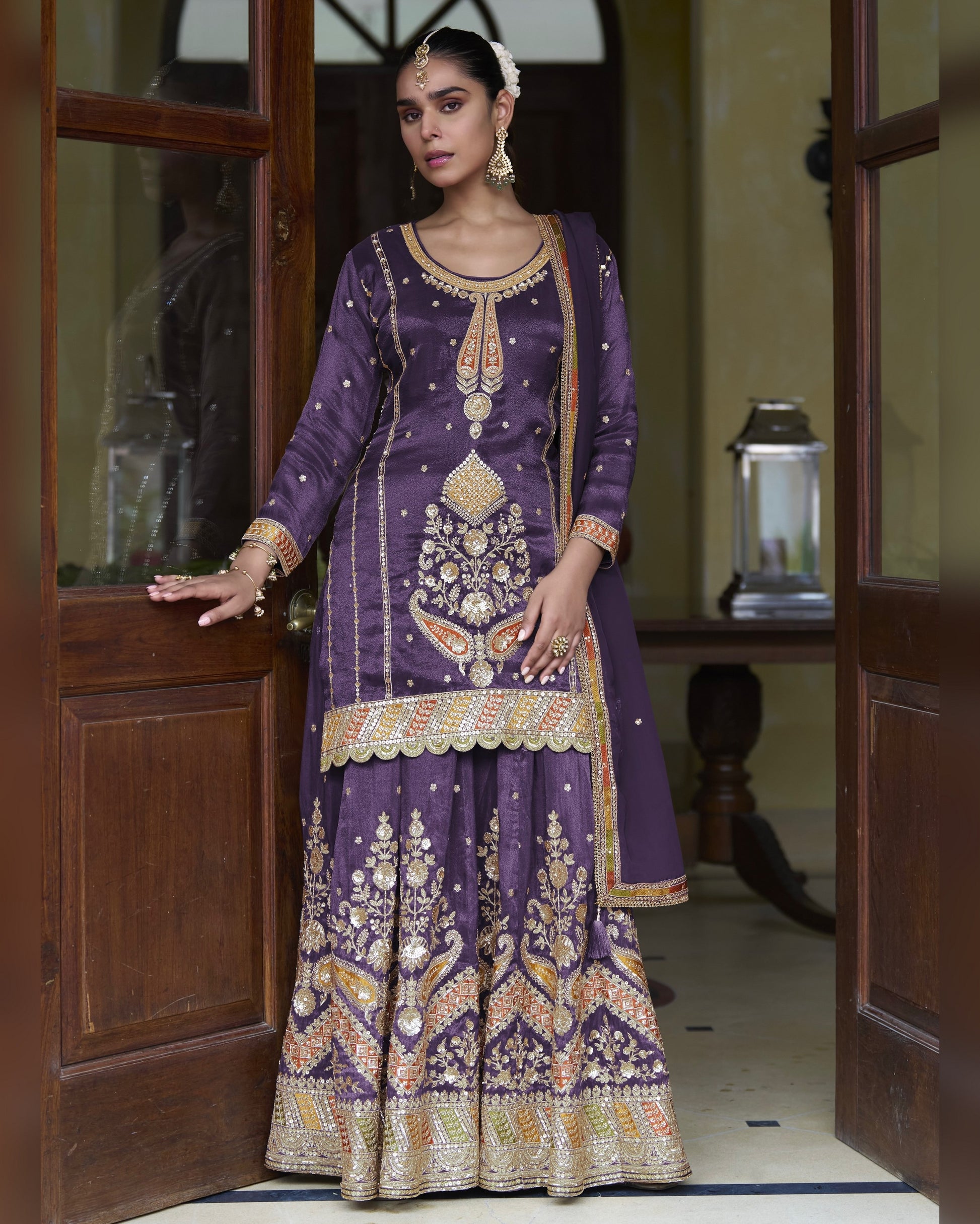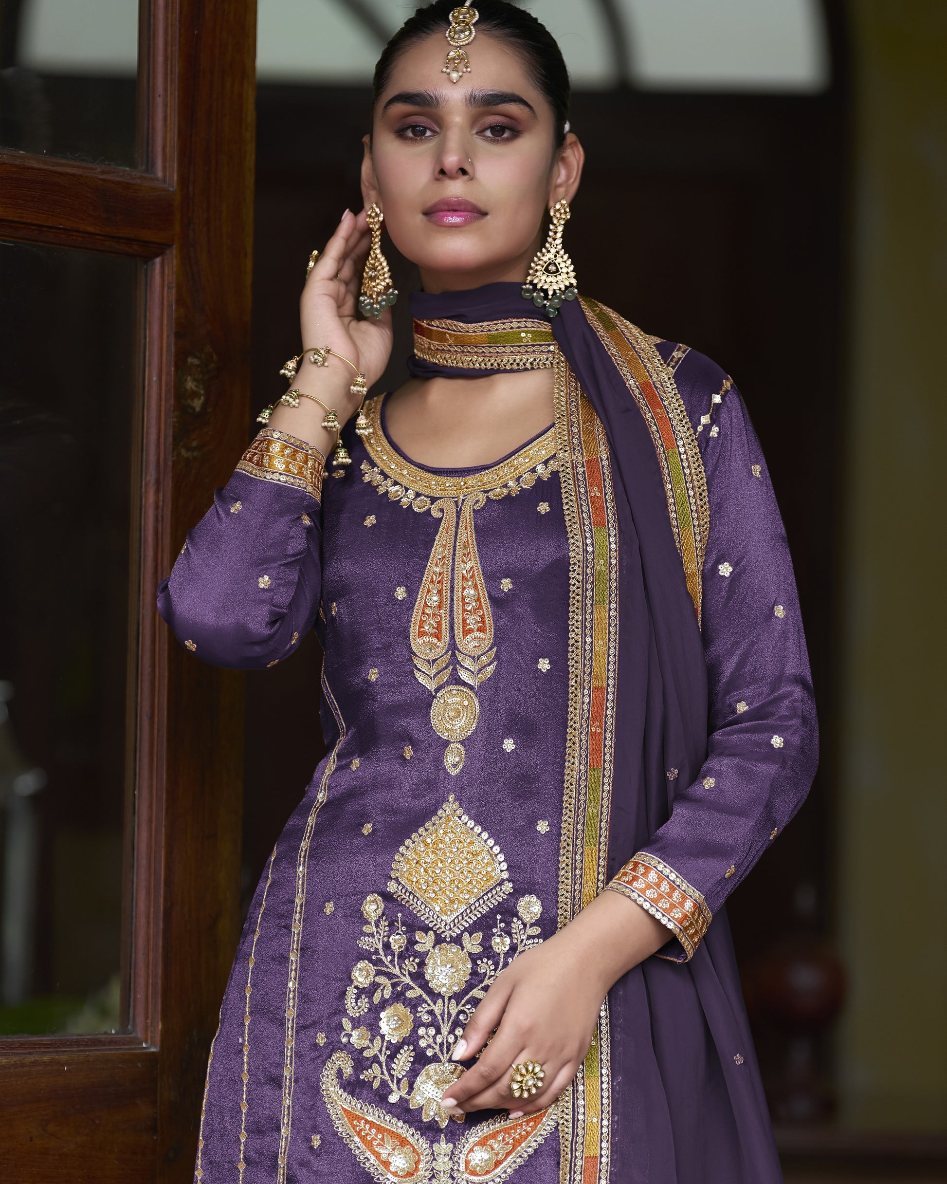 Crafted from premium georgette, this Purple Simer Silk Plazo Suit delivers an elegant three-piece ensemble ideal for Indian and Pakistani weddings and festivals. The intricately embroidered kameez, gracefully draped plazo, and matching dupatta showcase refined artisanal detailing that honors traditional craftsmanship. Designed with meticulous attention to both cultural authenticity and contemporary style, this suit offers the comfort and sophistication needed for extended celebrations. The harmonious blend of heritage techniques and modern tailoring ensures you'll make a distinguished impression while maintaining the ease of movement required throughout your festivities..