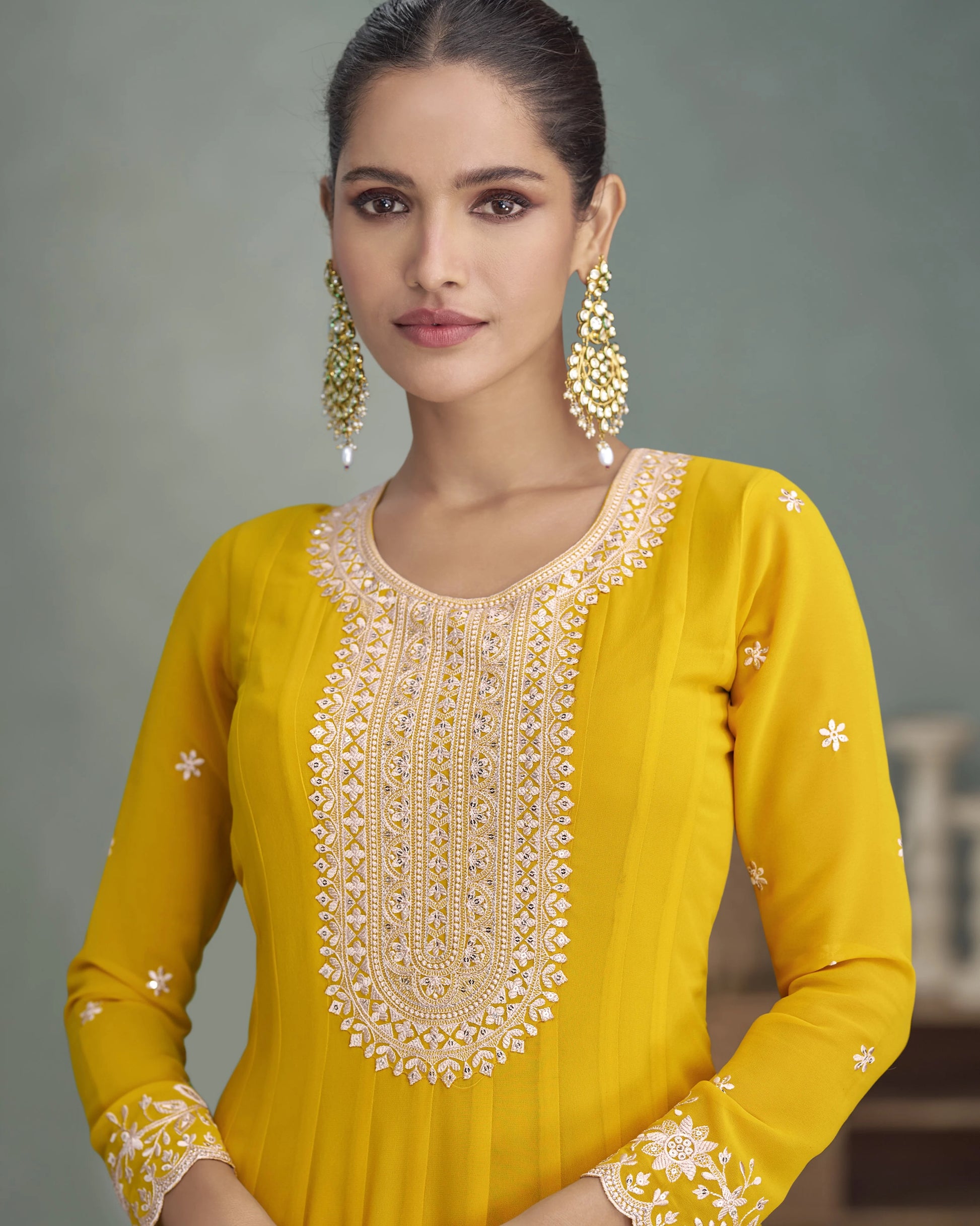 Yellow Georgette Anarkali Set For Indian & Pakistani Wedding Festival occasion - Thread & Sequence Embroidery